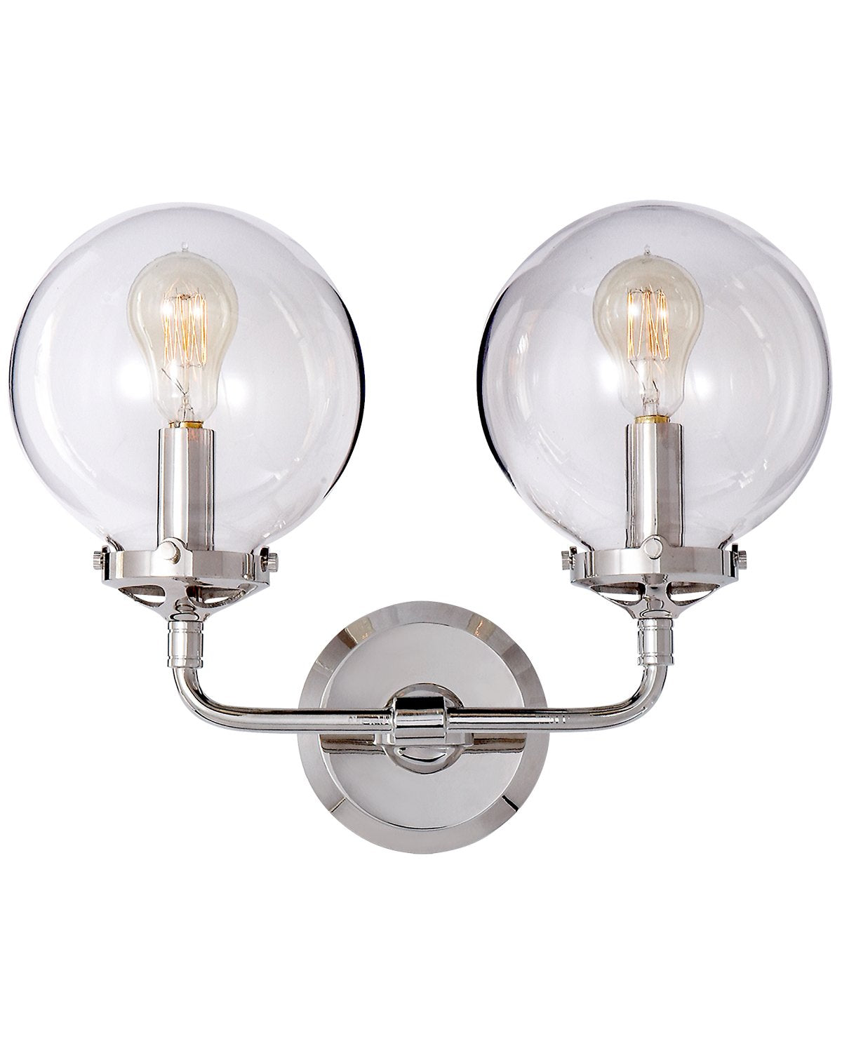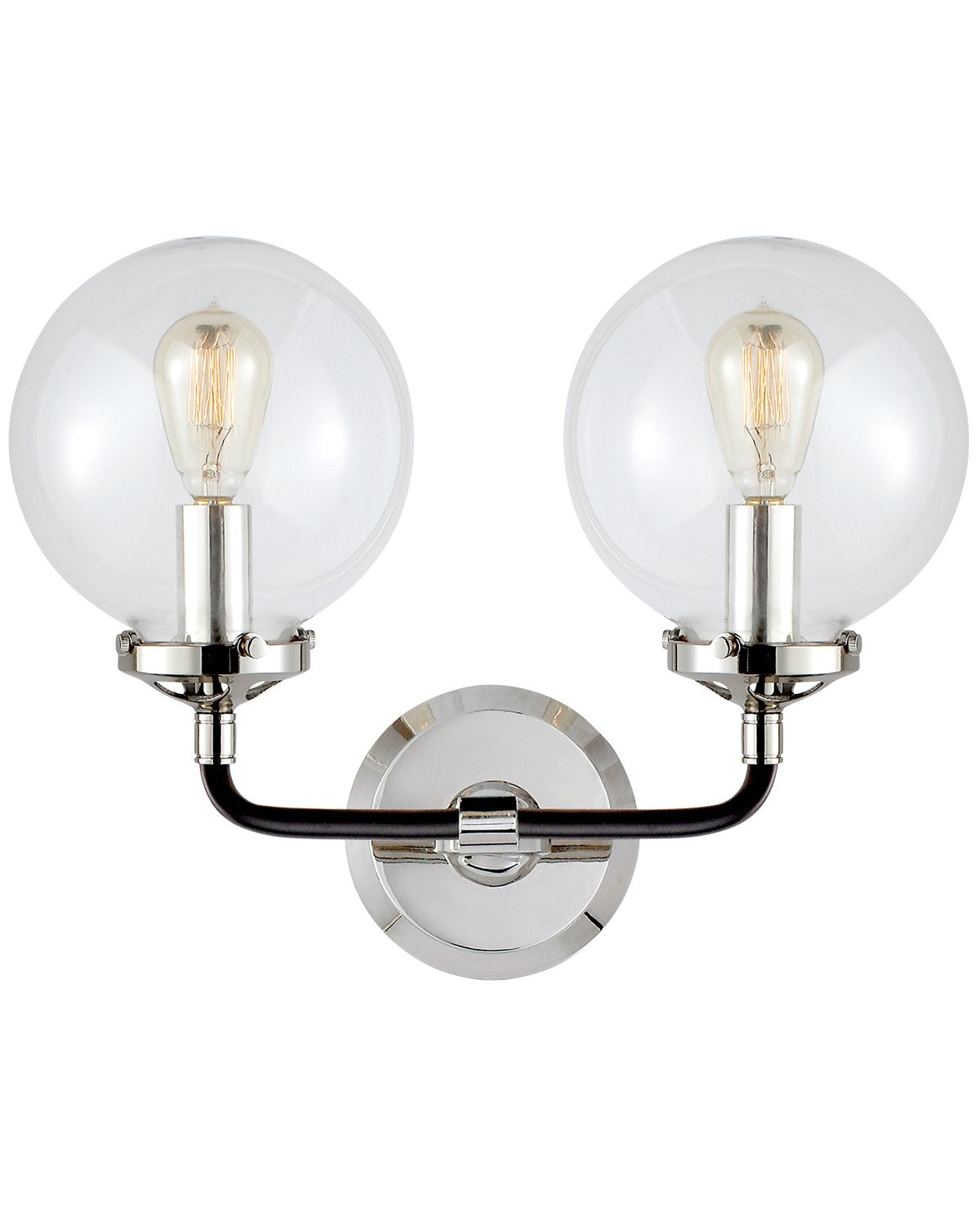 This bistro double light sconce in hand-rubbed antique brass and black gives off a mid-century modern, cool vibe. Its white glass glows when illuminated and will add so much character to your space.