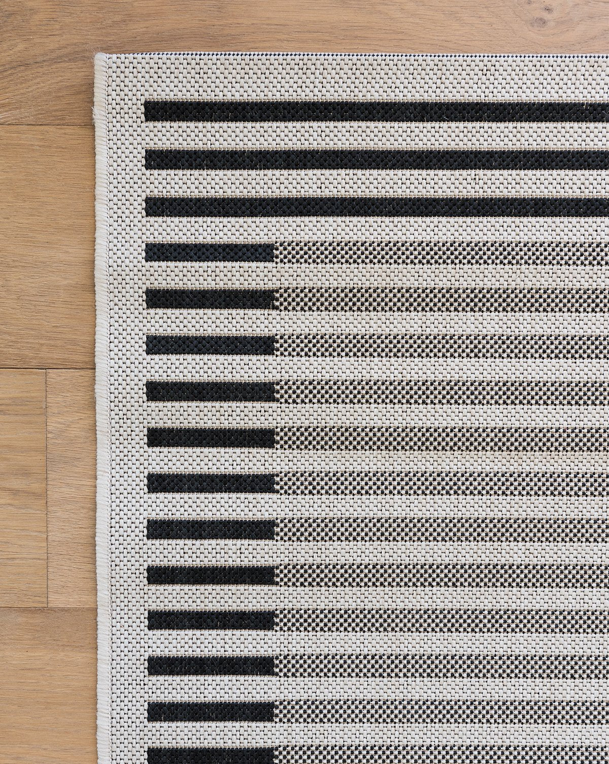 Inspired by coastal design, our Bordeaux Stripe rug easily anchors your space with a classic color palette. Safe to use indoors or out, this flat-woven rug boasts durable quality and sophisticated style with its dynamic stripe and color-block pattern.
