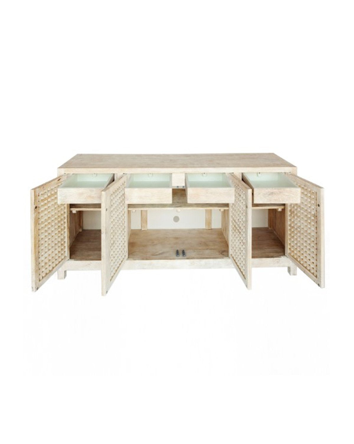 The Cody Lattice Credenza not only brings you a cool sun-bleached look, but also plenty of storage space for all your entertainment or dining needs. Its handcrafted lattice doors beautifully hide your entertainment systems, DVDs, or dining linens and serveware.