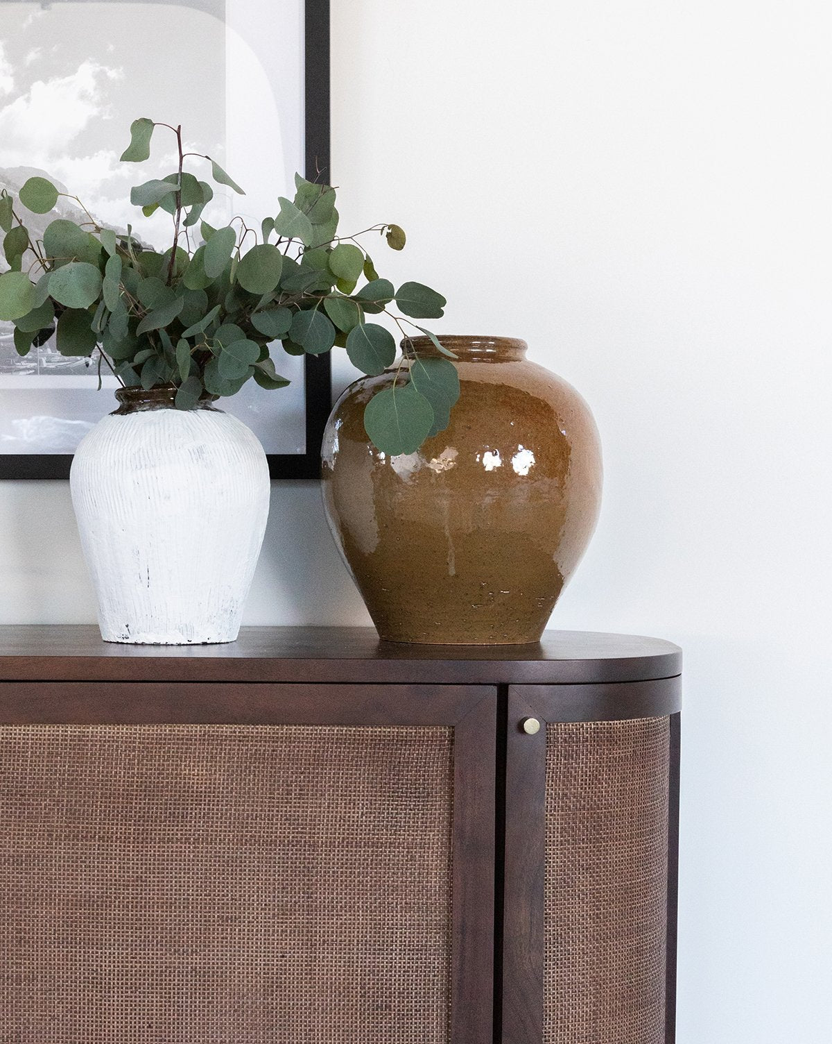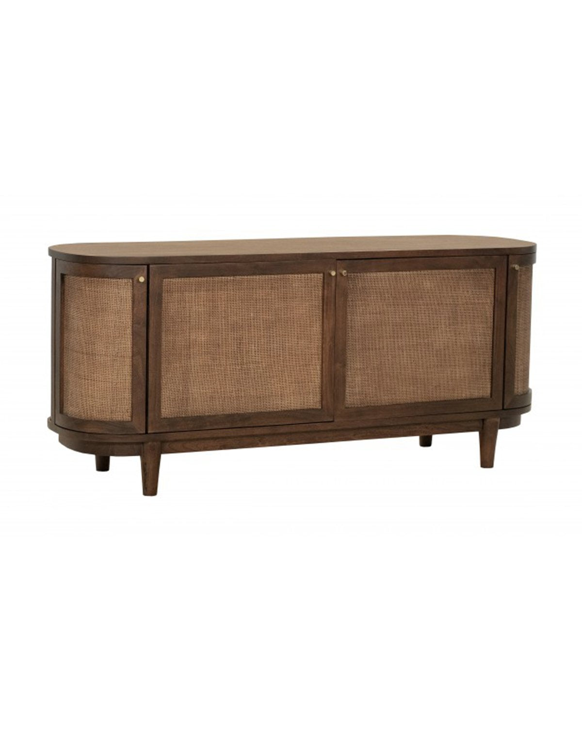 Embracing curvature, our Cullen Sideboard brings new form to your space. Its unique shape along with a deep, refined color palette brings beauty to anything styled atop its solid acacia frame. Intricate cane door fronts add another layer of high-end style while adding textural depth.