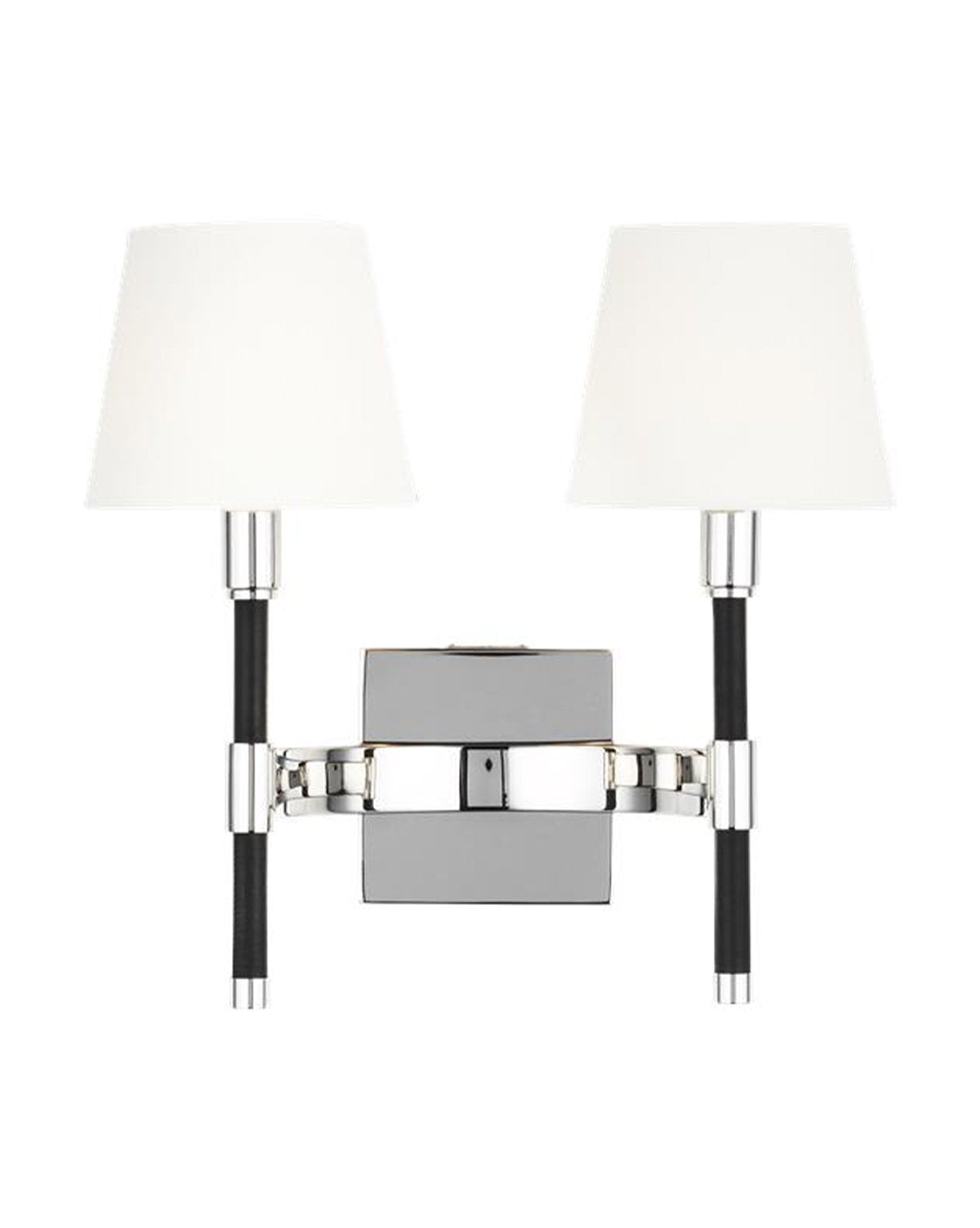With a modern feel, the Danica Double Wall Sconce puts mixed materials on display with its sophisticated form. Featuring a base finished in either a time worn brass or polished nickel, leather details on the arms in either a rich cognac or solid black complement the simple frame, adding a refined aesthetic to your home design.