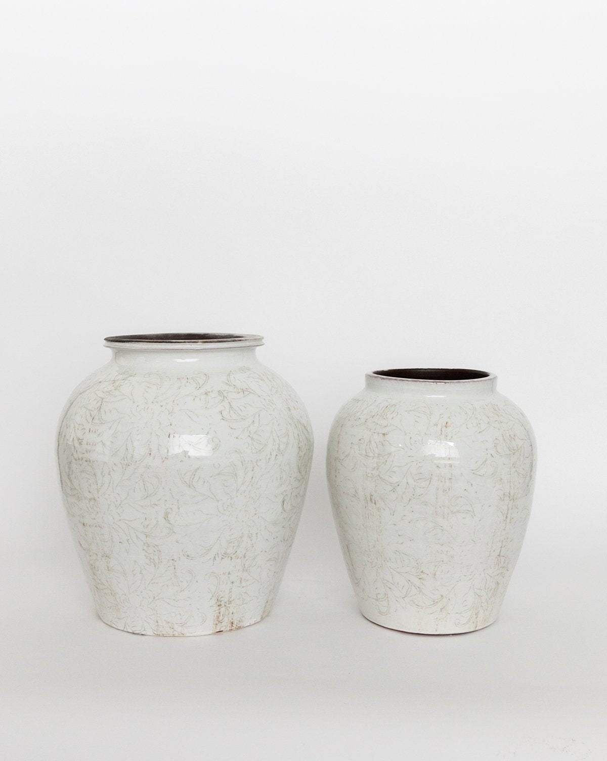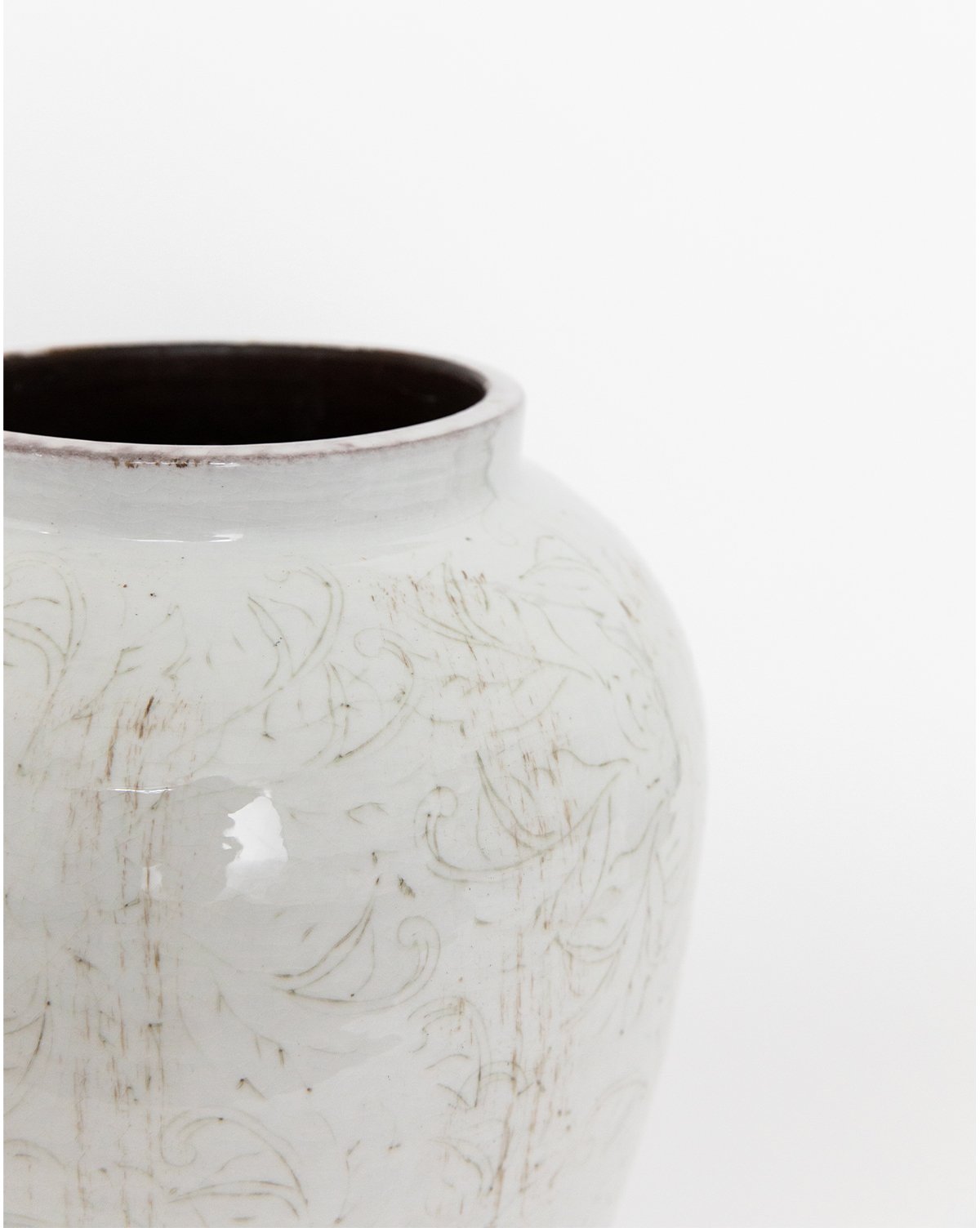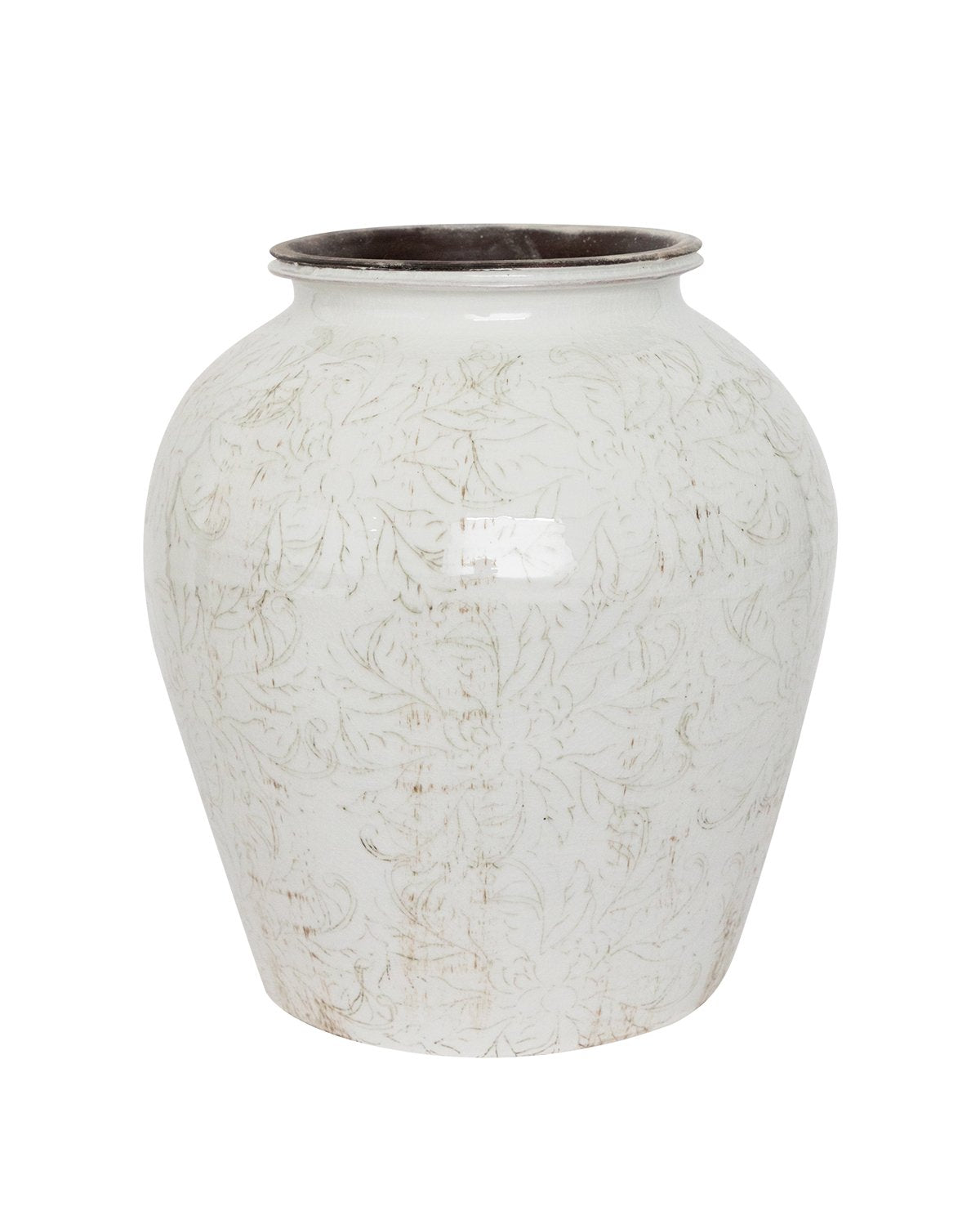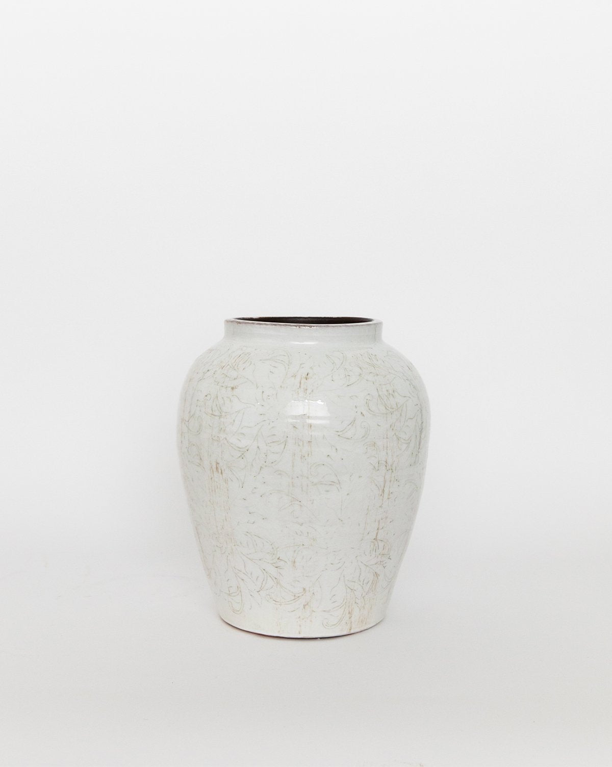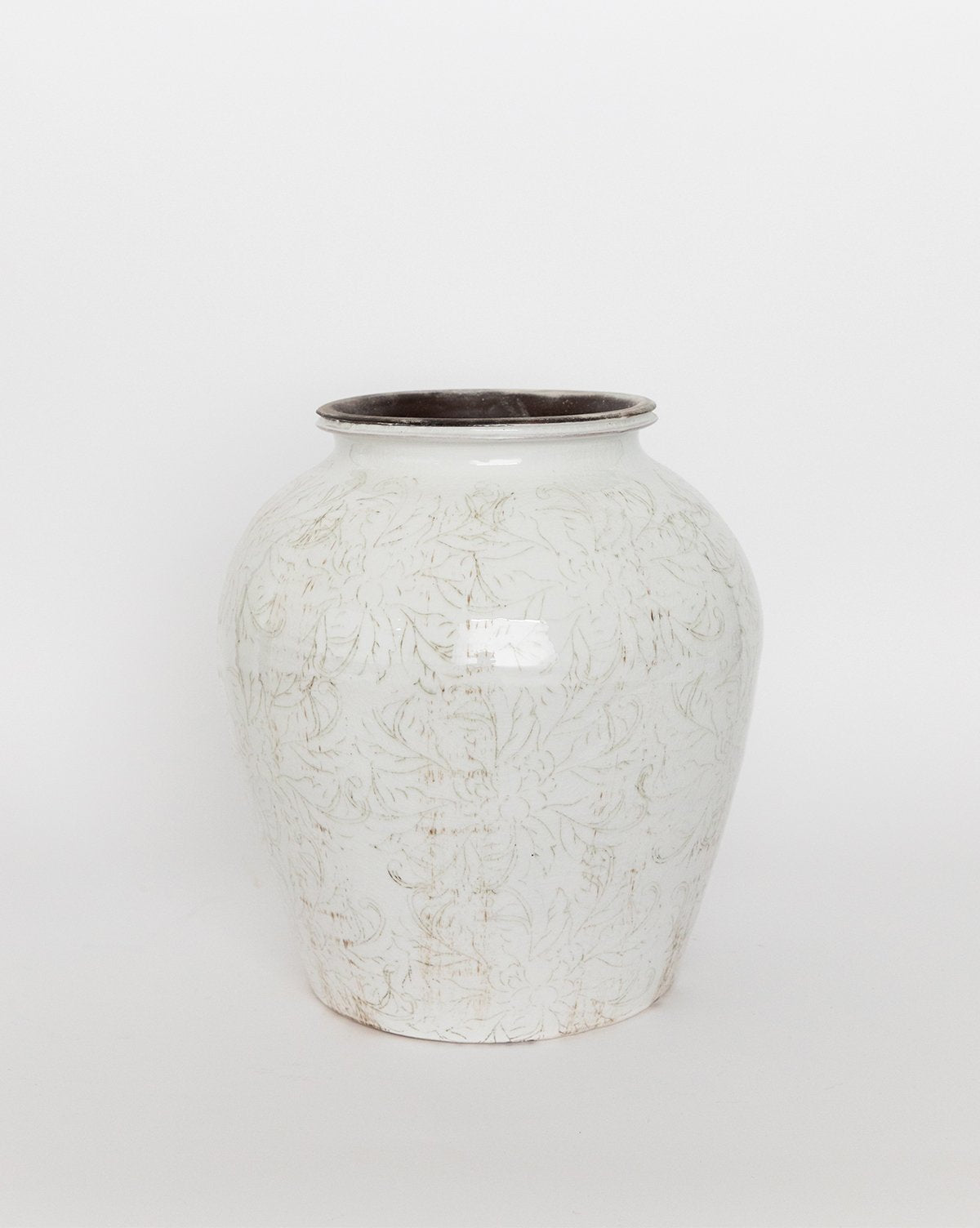 Crafted from high-quality ceramic, the Delicate Florals Vase holds its own styled in your built-ins or filled with a voracious display of florals. Its subtle floral scrollwork lends a sophisticated, lived-in feel, while a high gloss crackle glaze finishes off its classic tapered form.