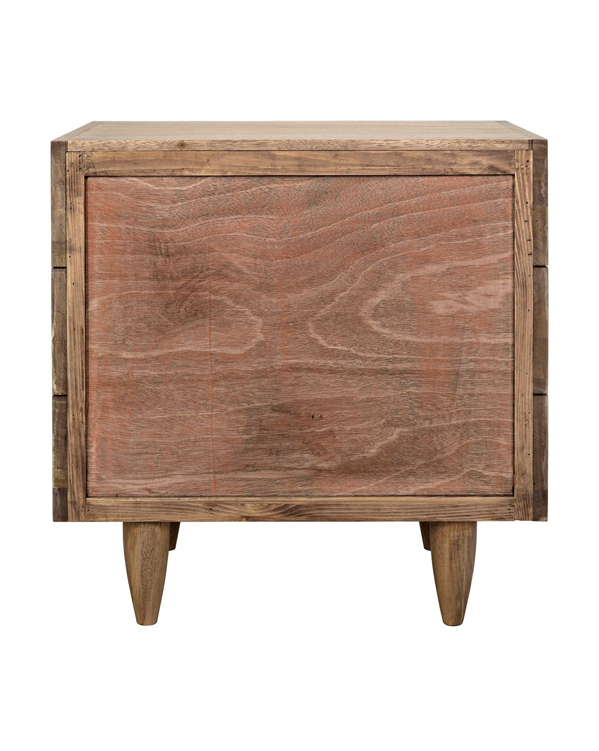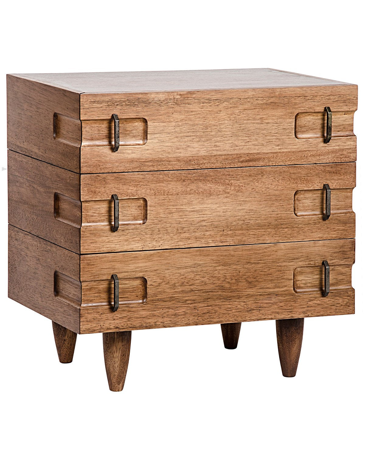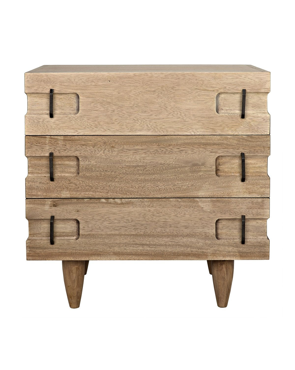 The Dexter Nightstand goes against the grain of its natural walnut make with a contemporary design. Carved details at the corners add dimension to its boxy shape, while vertical black metal hardware add an eclectic touch to its natural wood origins.