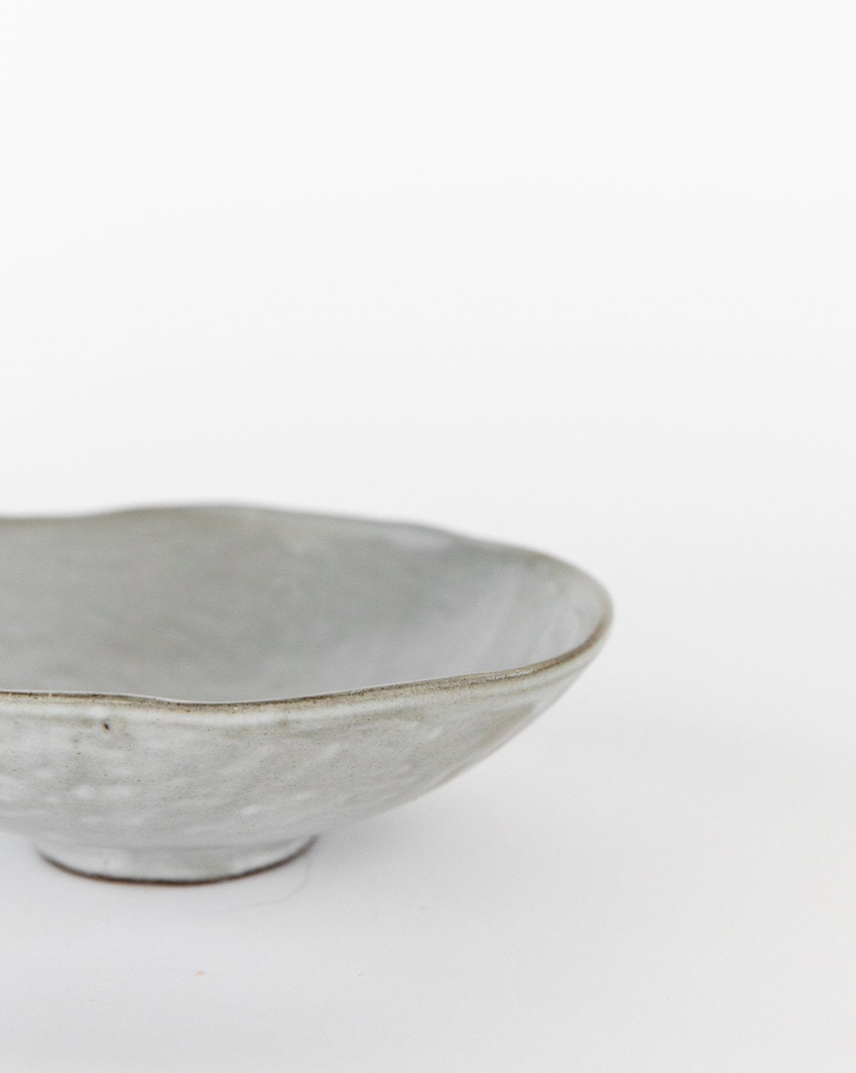 With a slight pedestal shape, and unique stoneware texture, this bowl is finished in a matte white glaze with just enough imperfections to bring beauty to its unusual form. Whether it’s holding decorative beads on your coffee table, or artichokes in your kitchen let its updated form add a touch of visual interest.