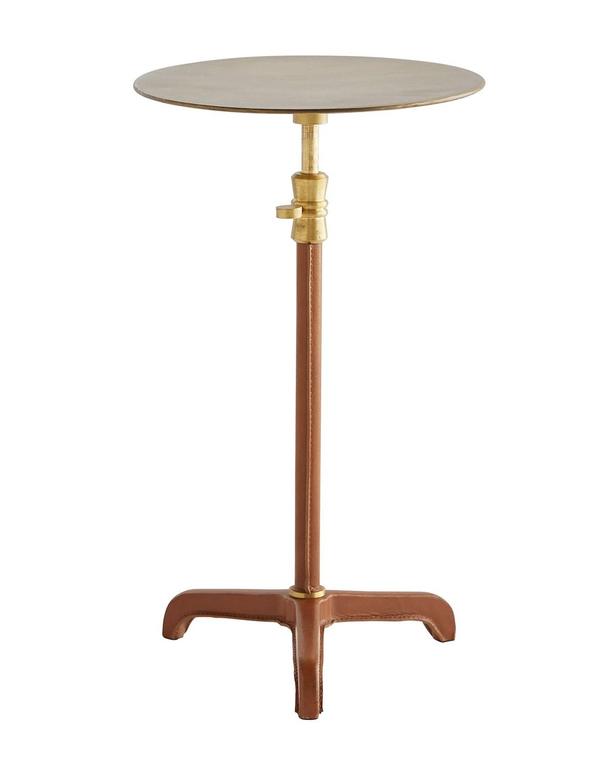 Beauty is evident in the form and details of the Emma Side Table.  Both the top and adjustable stem are made of brass, but finished in brushed and antiqued gold respectively.   Wrapped in cognac leather with exposed stitching, the base proves its craftsmanship quality.