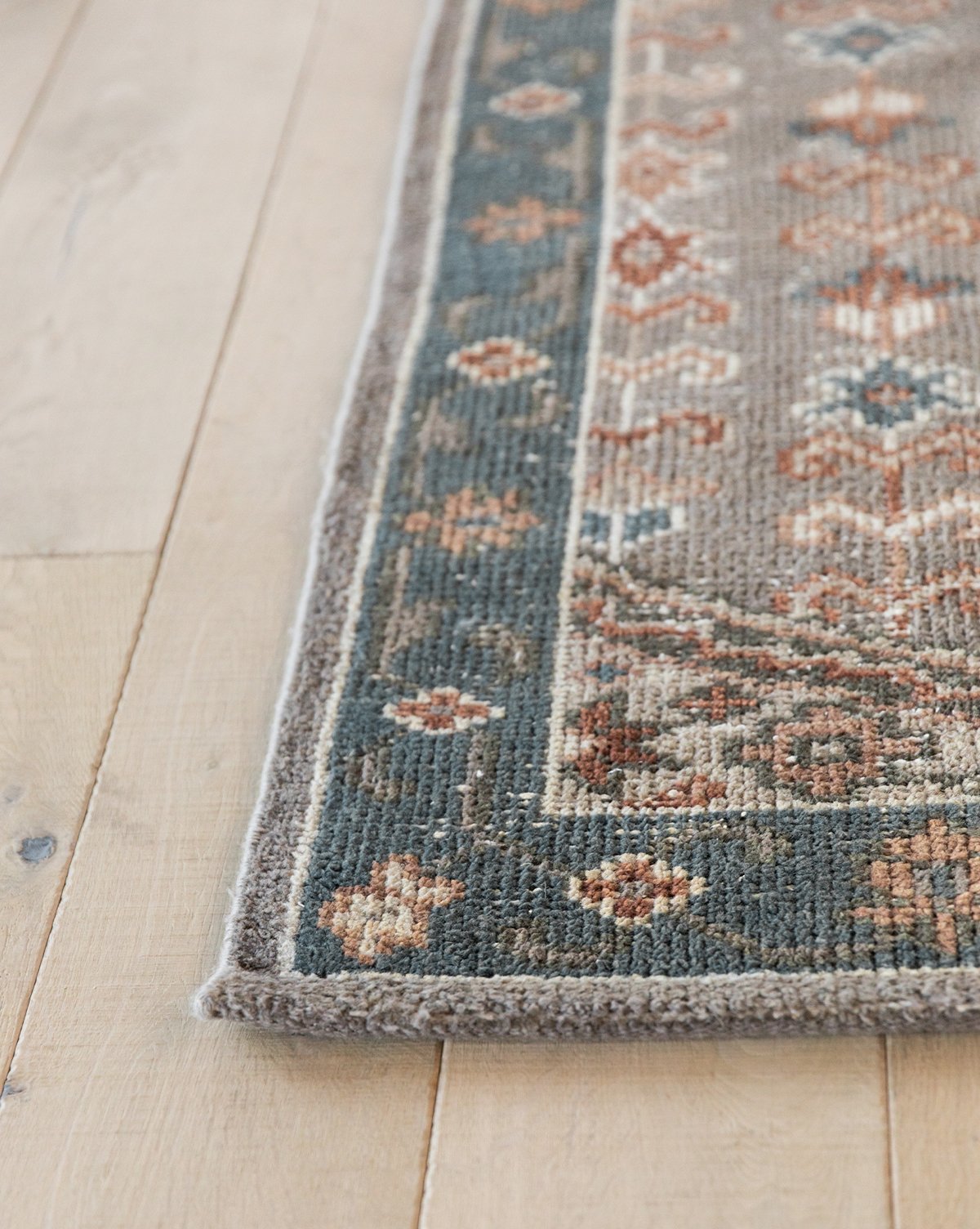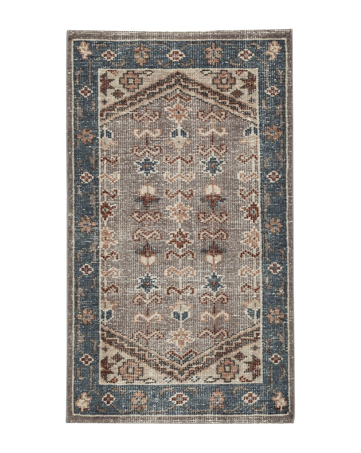 Hand-knotted by skilled artisans, our Evie Rug mixes color beautifully creating a unique patterned motif. From the deep blue hues to the tonal browns, this 100% wool rug anchors your space with a warm, comfortable feel.