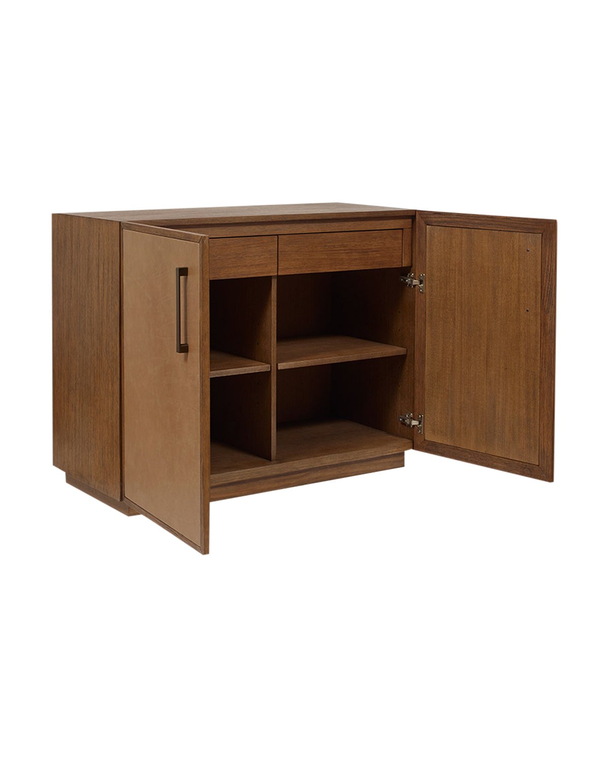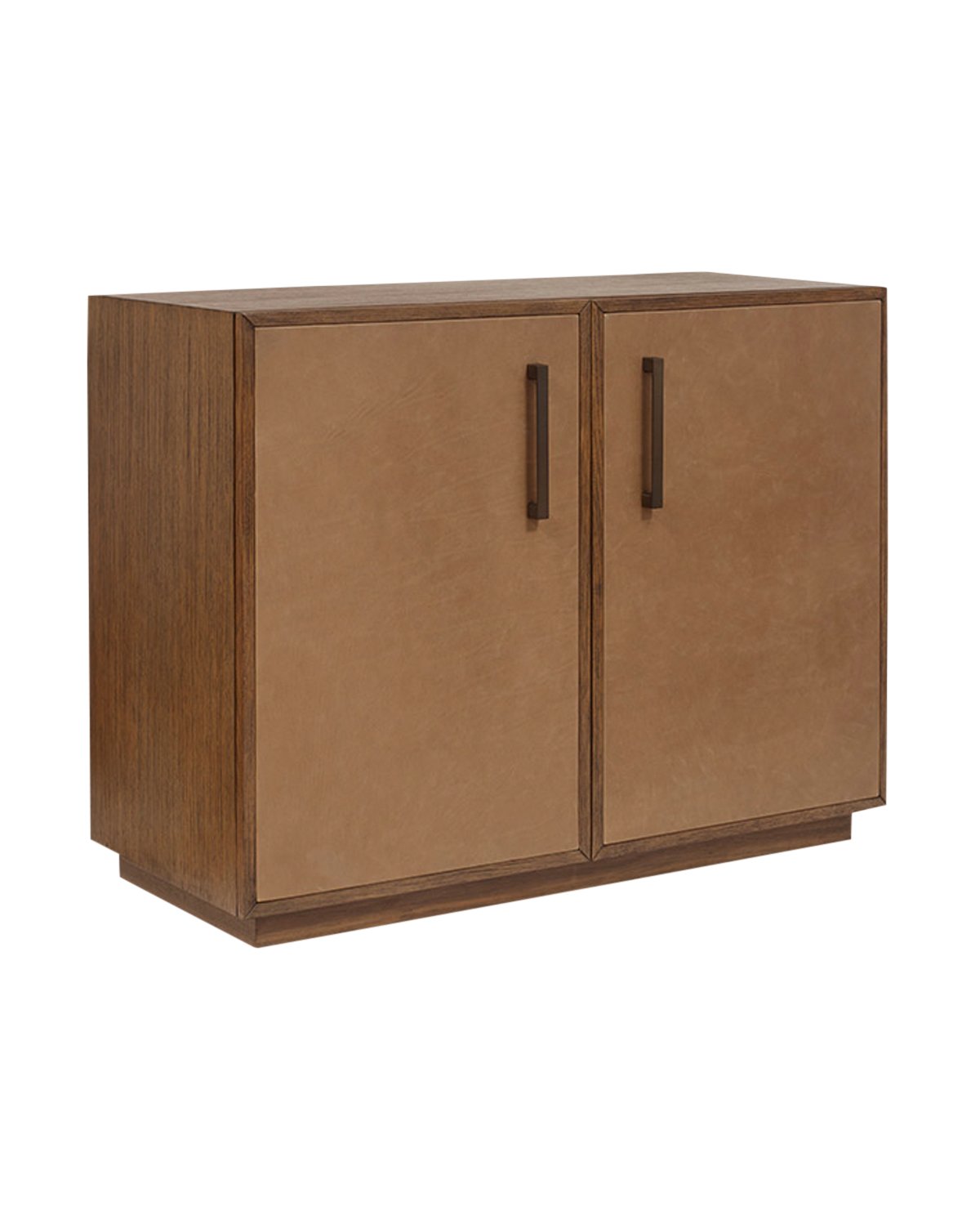 Covered in rich italian leather, the doors of our Gerald Cabinet update its timeless design. Its wire brushed oak frame features subtle natural tones, complementing the warm hued leather and antiqued brass hardware.