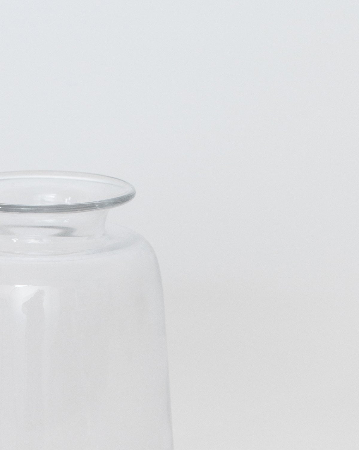 Our Glass Flower Vase features a universal silhouette, perfect for filling with flowers or simply adding a layered element to your coffee table styling. Its classic design is finished with a scissor-cut rim for a streamlined, clean look.