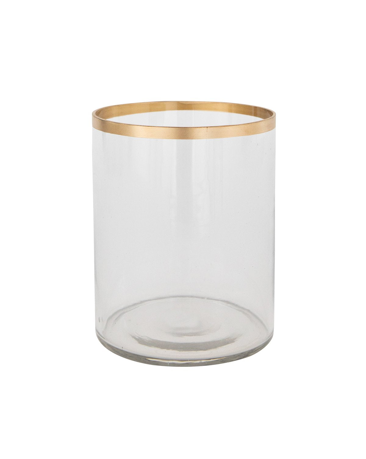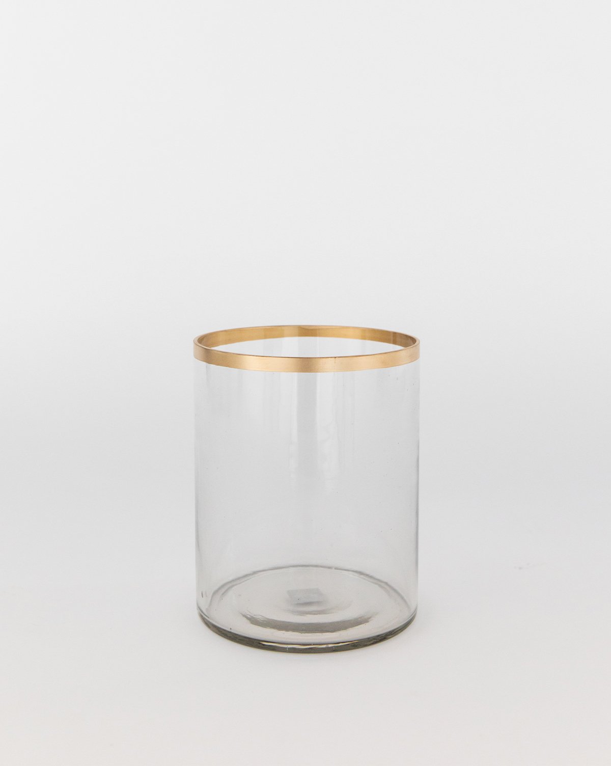 With a simple cylindrical shape, the Gold Rim Glass Vase is both sophisticated and versatile. Its subtle gold rim adds a refined touch while complementing greenery or flowers placed within its classic form.