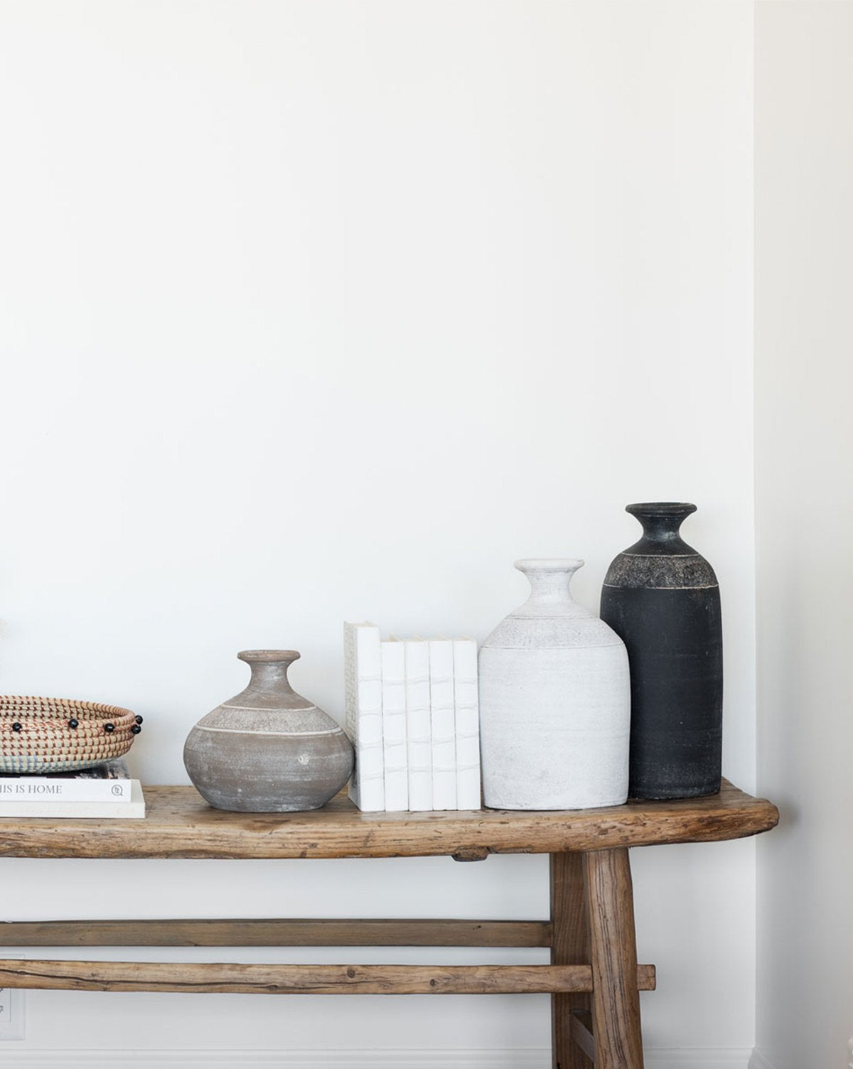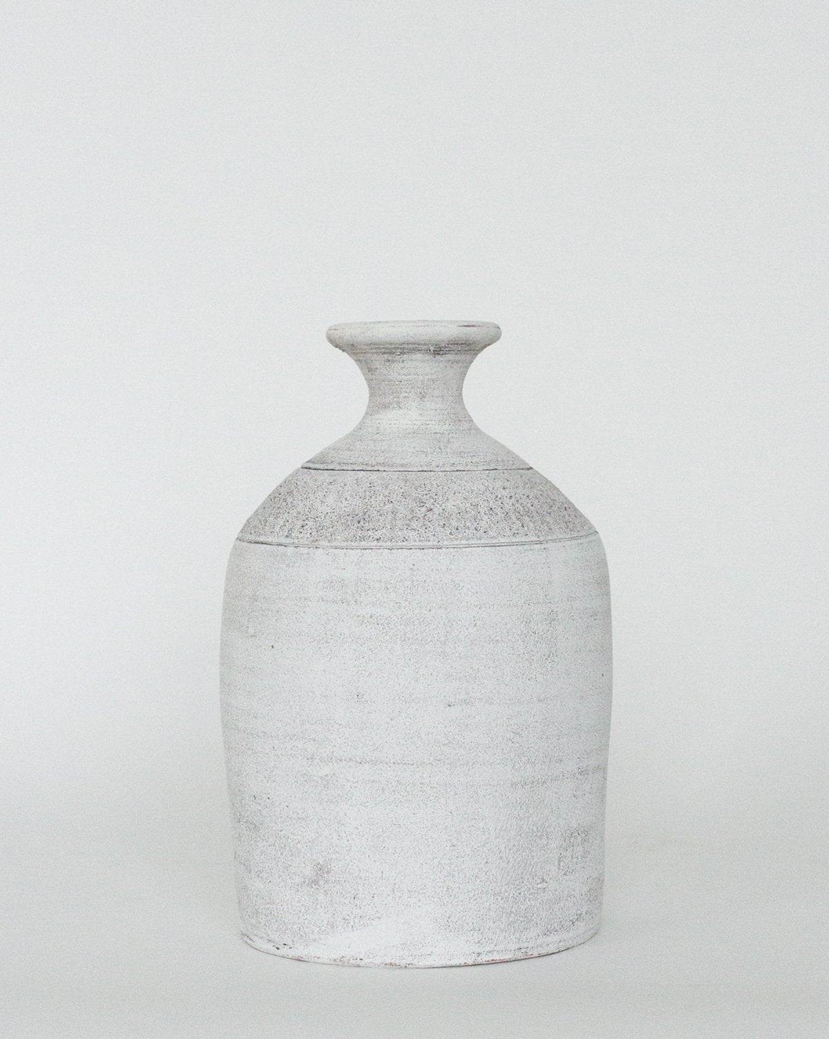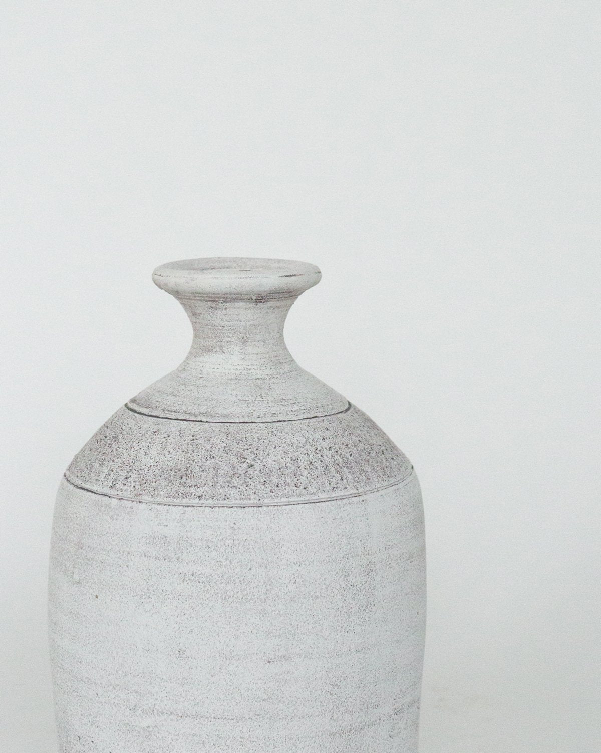 Crafted from clay, the sculptural silhouette of our Hakan Vase brings ethereal beauty wherever it’s placed. Subtle tonal contrast takes form with a simple stripe detail, as slight distressing lends a found feel to its old-world design.