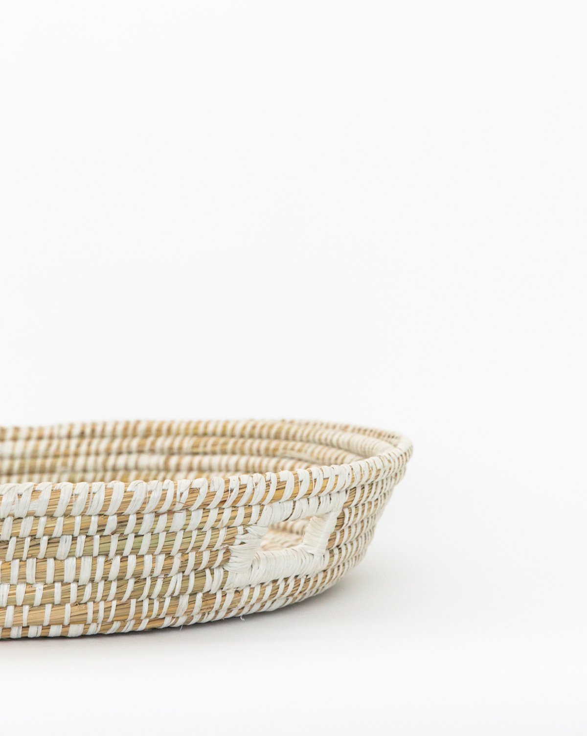 Handwoven by skilled artisans, this natural grass basket is built big, with added handles for function. Its interwoven white and natural weave creates interesting character while holding linens, or other decor around the house.