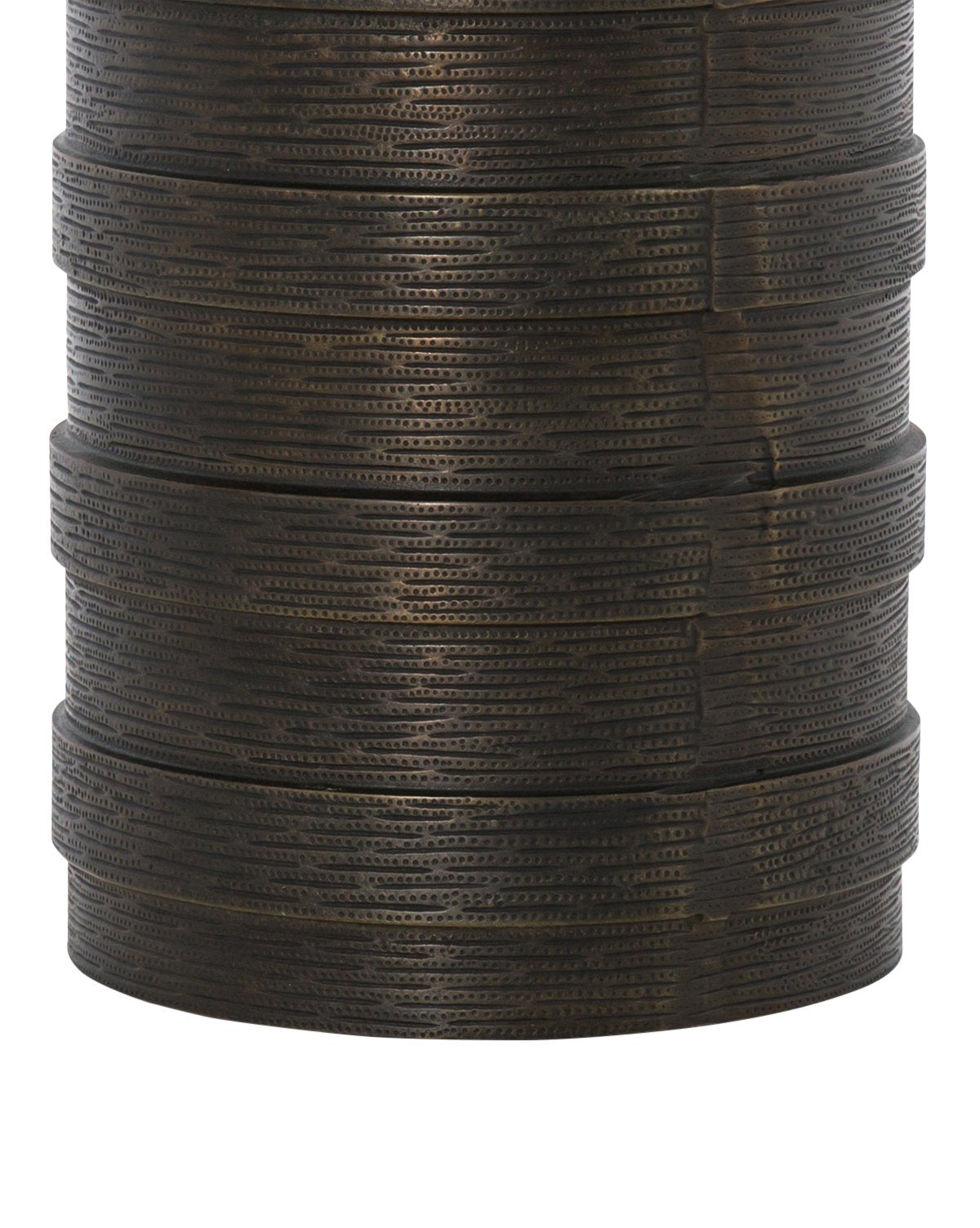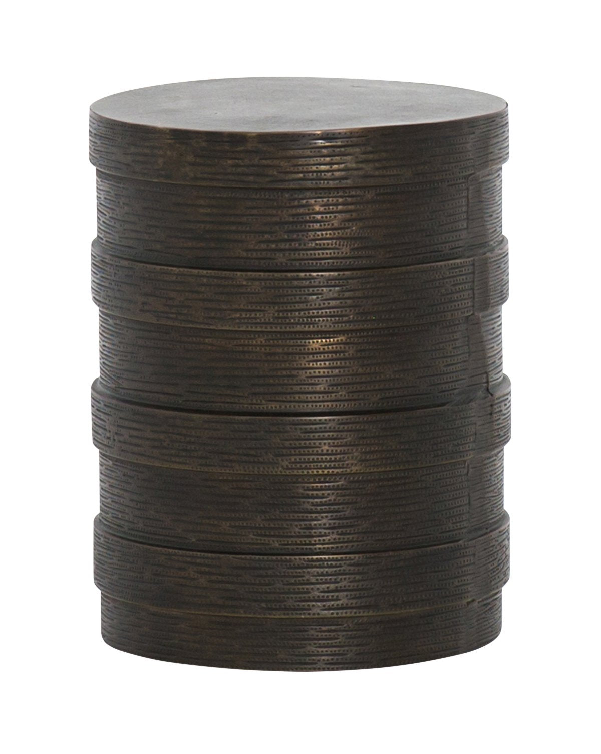 Channel detailing brings texture to this brass-finished aluminum side table. The deep bronze tone adds eye-catching depth to this piece making it anything but ordinary.