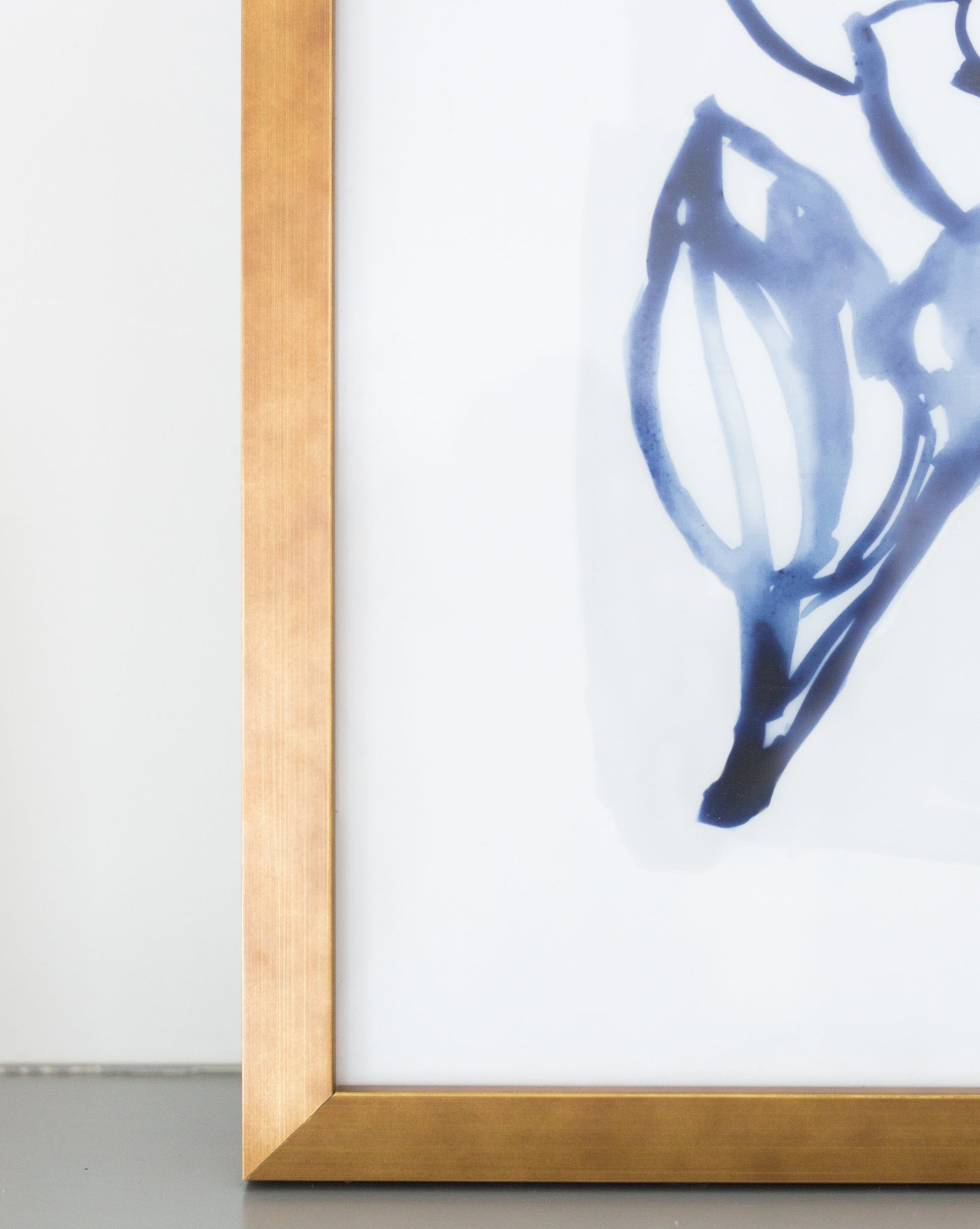 The imperfection in watercolor brings character and depth to the Indigo Botanical collection.  Created in a rich indigo, these expressive branches create great contrast against a brushed gray background and accented brass frame.  Make a statement with both prints whether hung alone or side-by-side.