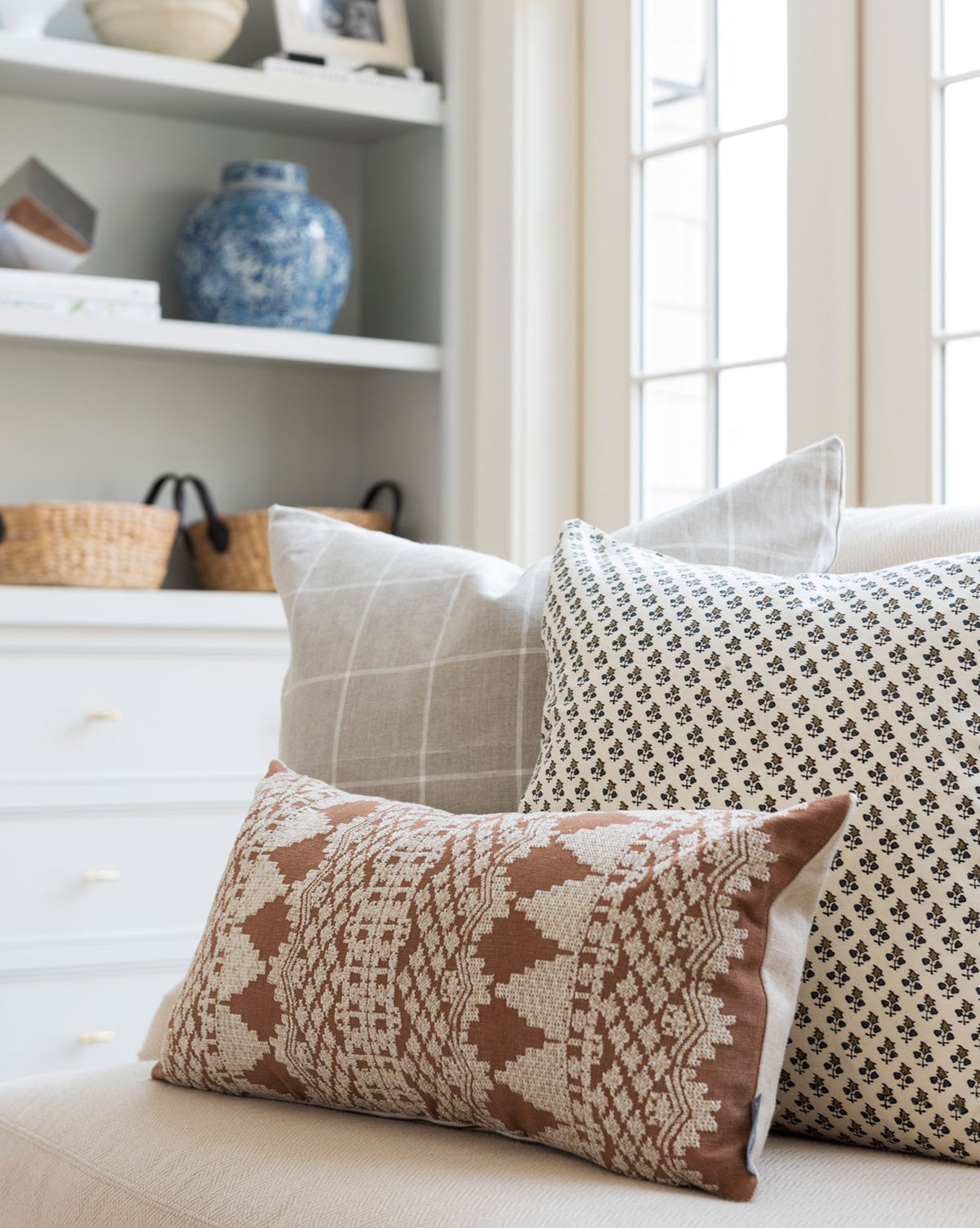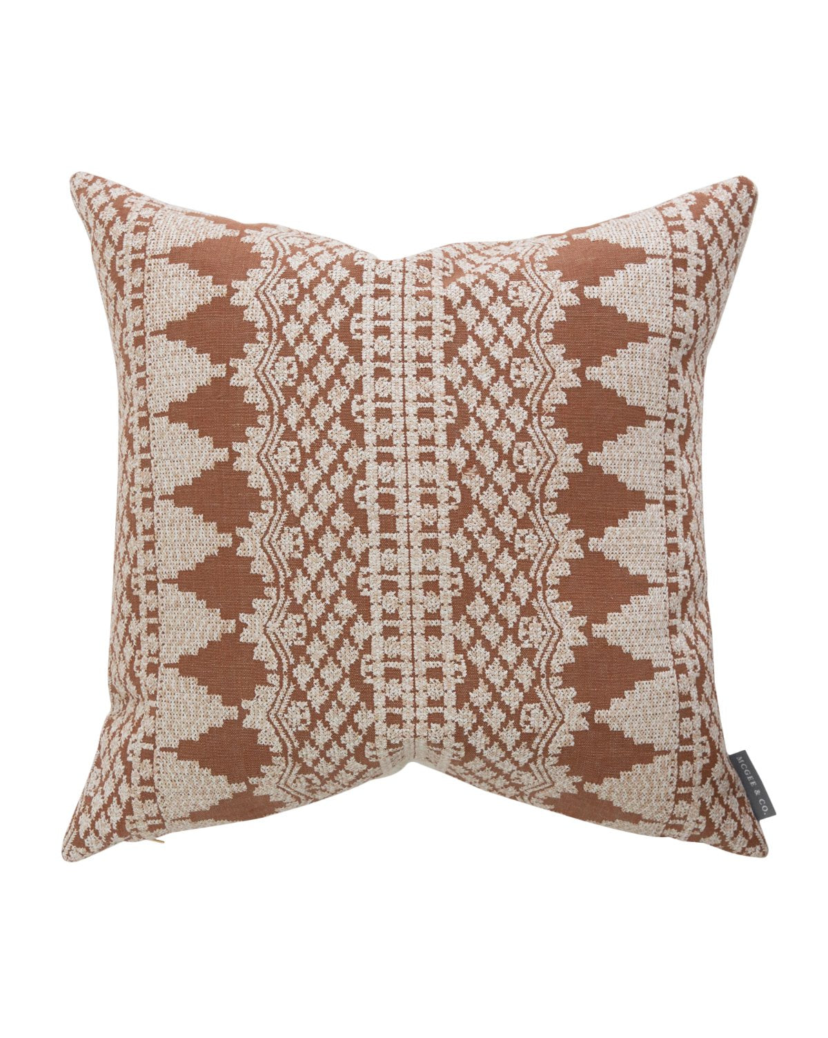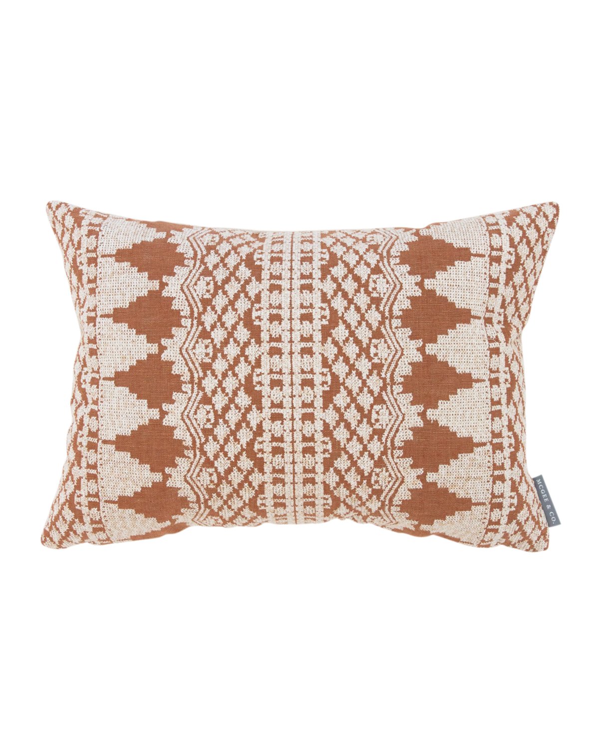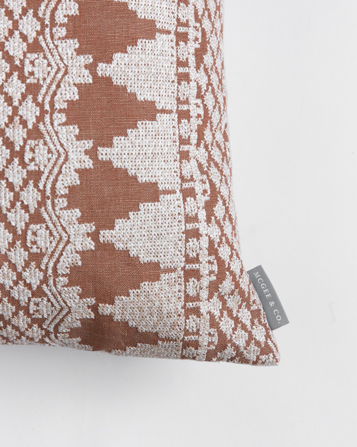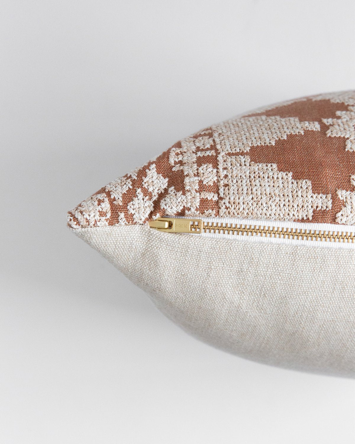 The Lisbeth pillow cover is crafted in India, and includes all the handmade allure of the country’s textiles. Its cross-stitched pattern was designed with subtle tonal variation to bring added dimensional form to its rare rust color––all built on a foundation of jute and linen.