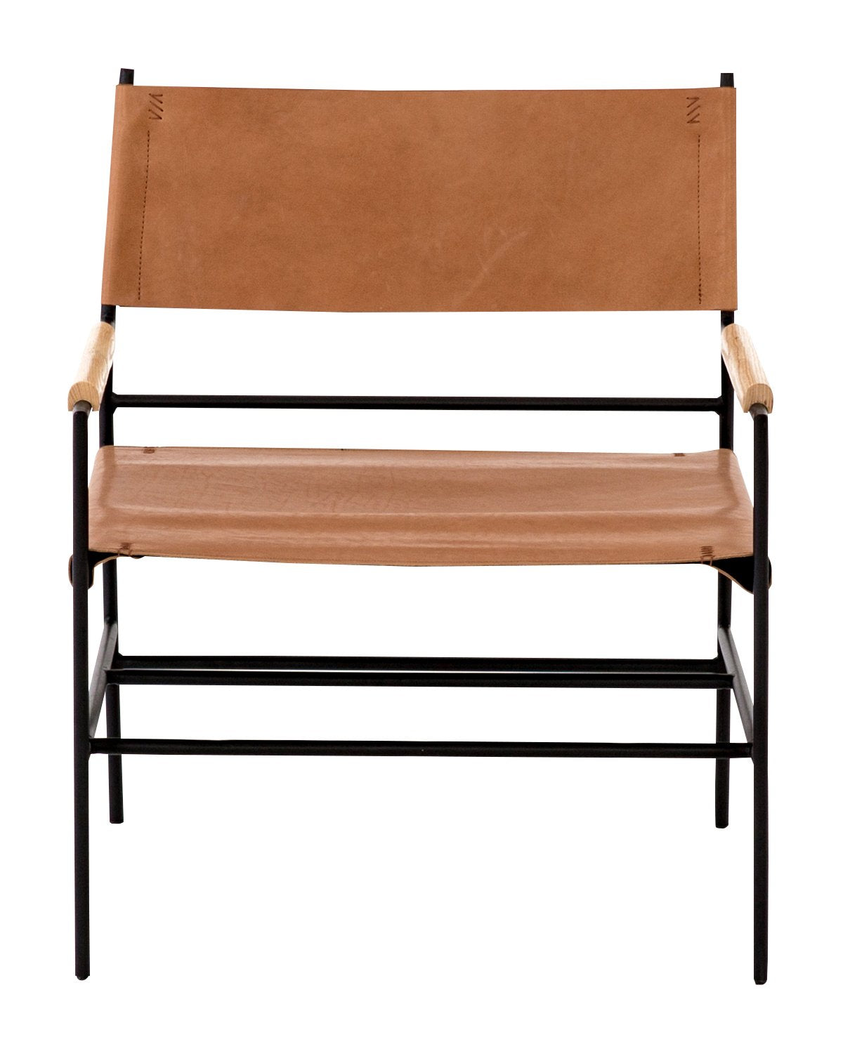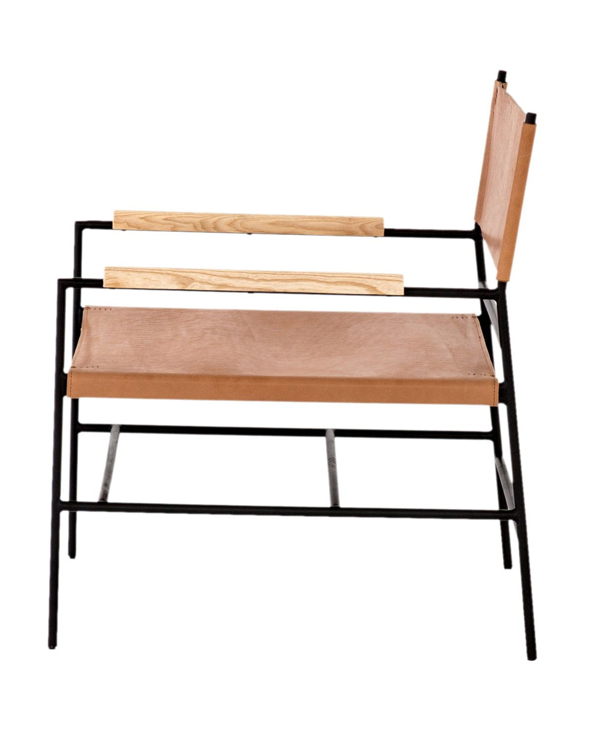 The Mackenzie Chair is modern in form, and artisan in make.  Its slim black metal frame is outfitted with top-grain buffalo leather in sling-style seating and wrapped arms of bleached ash.  Complete with hand-stitching for proof of its master detailing.