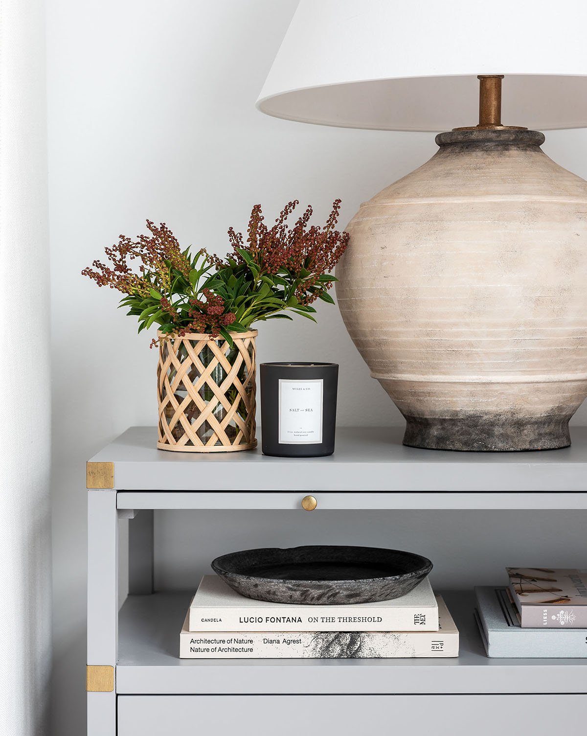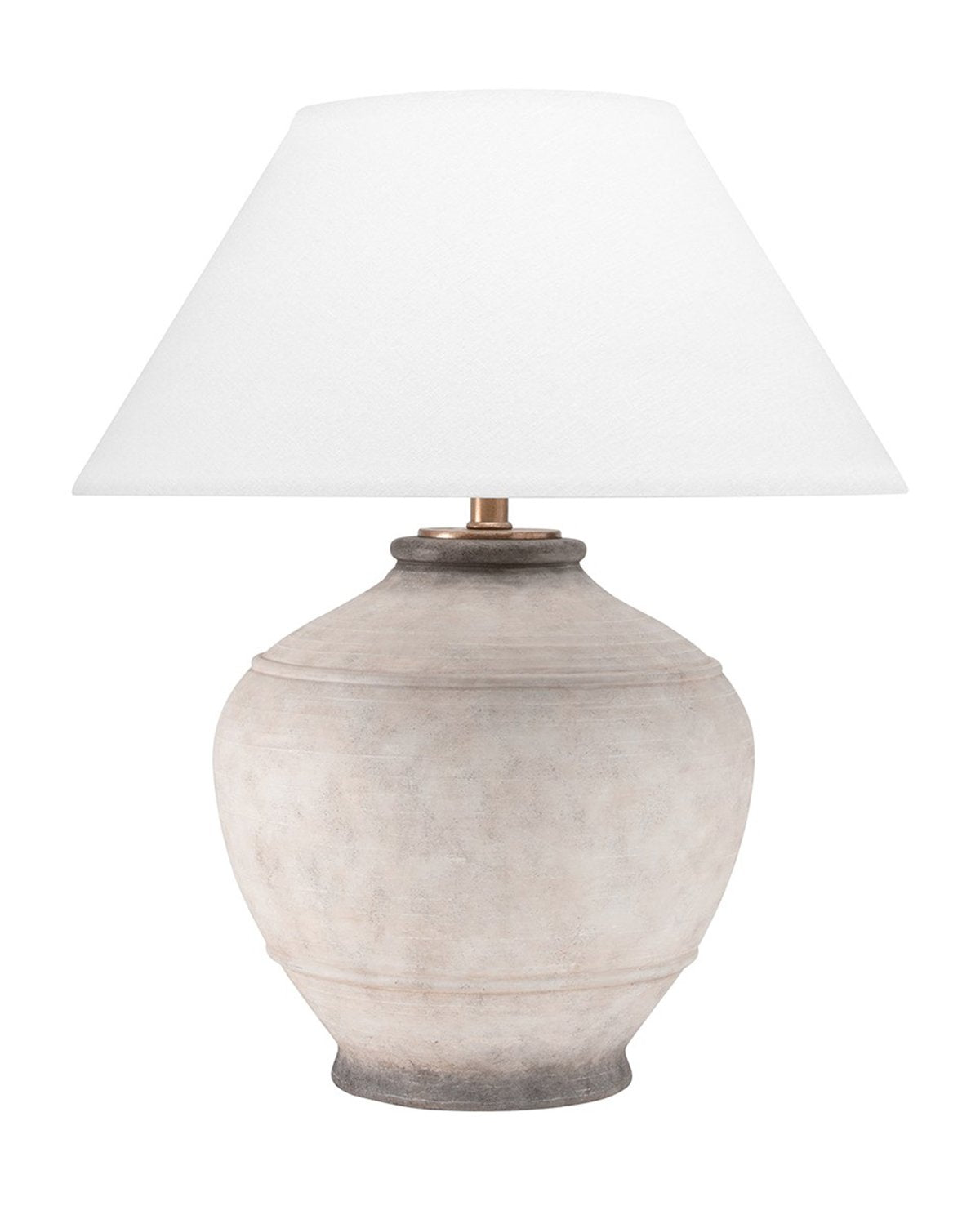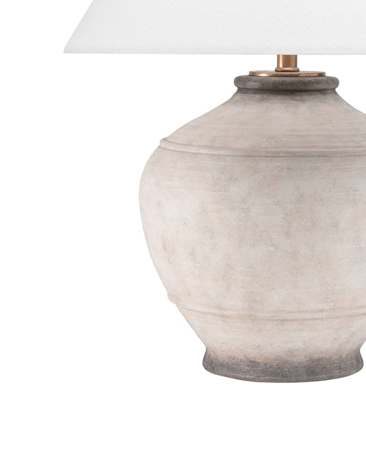 Crafted from stone, this lamp brings found charm to your space. With a soft color and unique ribbed details, the bulbous shape of our Malta Table Lamp subtly contrasts with Belgian linen shade for both depth and sophistication.