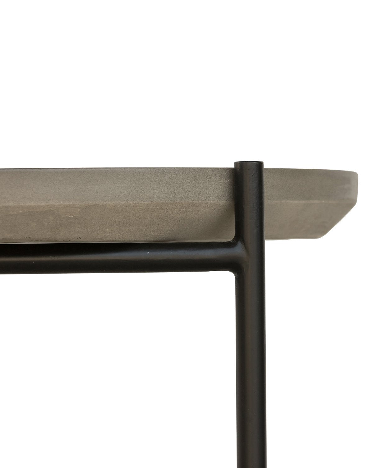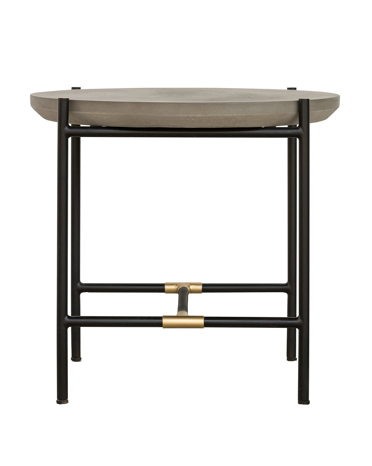 Using an industrious mix of materials, our Marino Side Table is crafted from black iron and sturdy concrete. A unique slim, structural base of black-finished iron legs elevates the design, as brass joints draw interest. Finished with a rounded slab of concrete atop its minimalist frame, this side table adds an impressive presence wherever it’s placed.