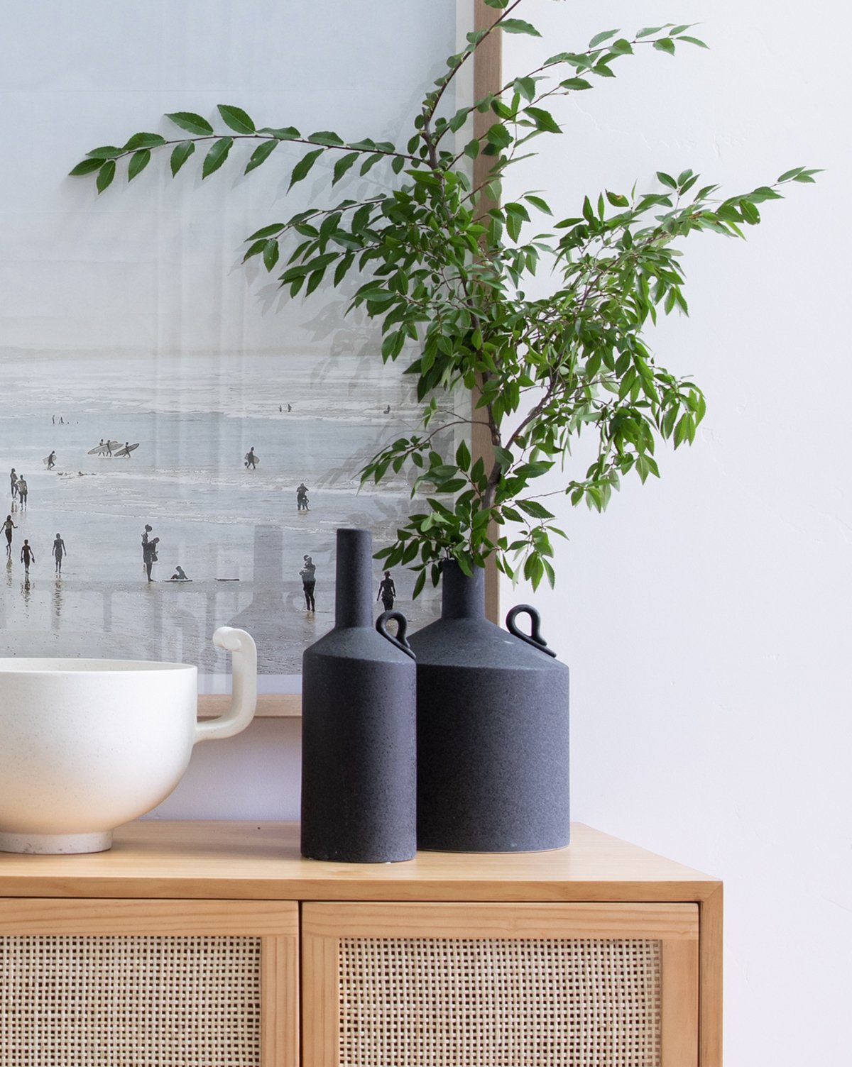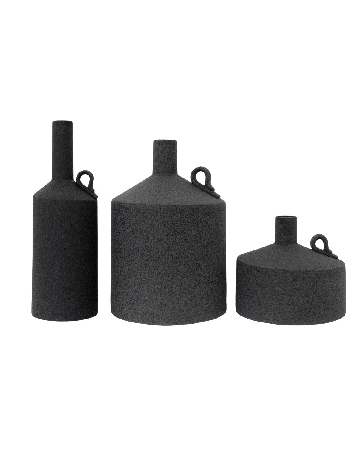 Tall and skinny to short and round, each Metropolitan Vase brings unique shape and form to your space, along with a black reactive glaze. Featuring a curled handle detail, these vases lend interest simply styled as a pair or as part of a curated collection.